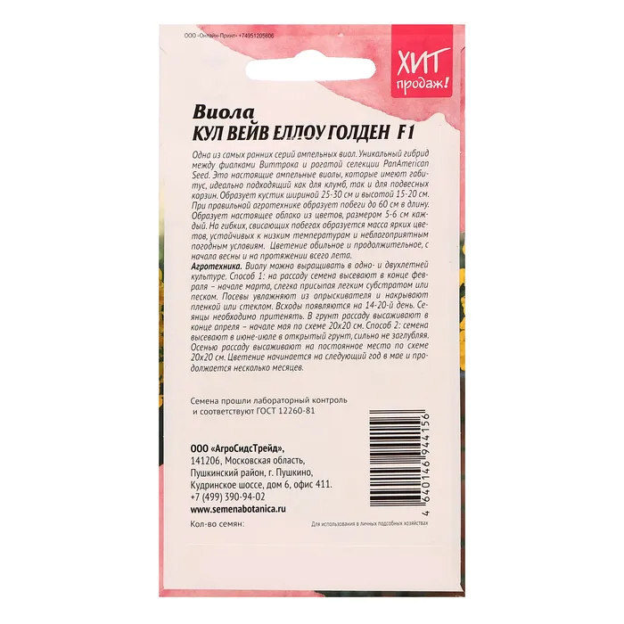Семена цветов Виола "Кул Вейв Еллоу Голден F1", 5 шт — Характеристики