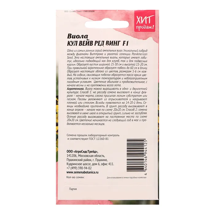 Семена цветов Виола "Кул Вейв Ред Винг F1", 5 шт — Характеристики