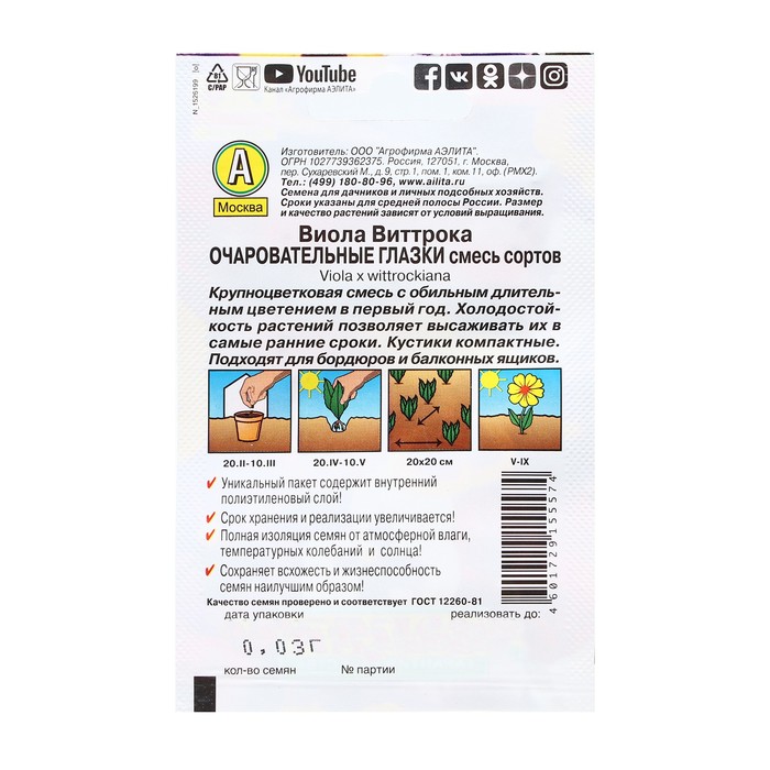 Семена Цветов Виола "Очаровательные глазки", смесь сортов, 20 шт — Характеристики