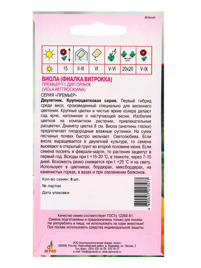 Семена цветов Виола «Премьер Дип Оранж«, F1, 8 шт., «Агрос» — Характеристики