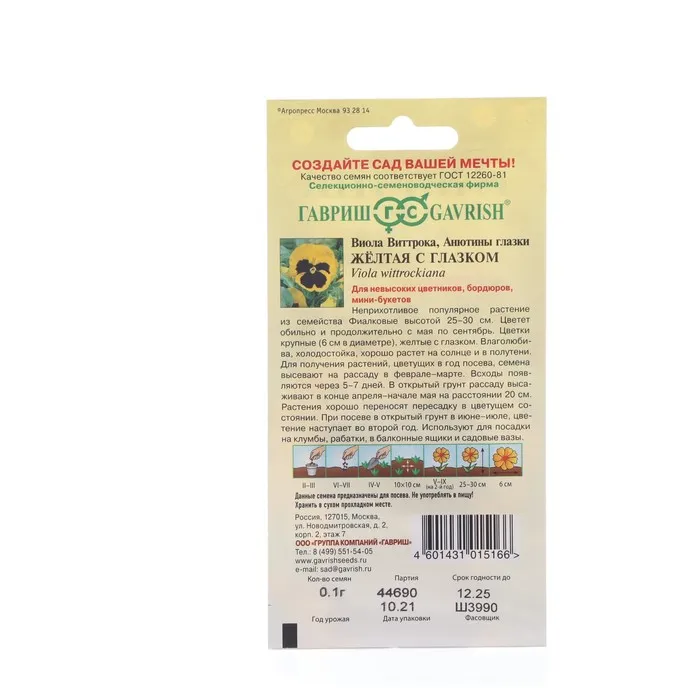 Неприхотливое популярное растение из семейства Фиалковые высотой 25-30 см. Цветет обильно и продолжительно с мая по сентябрь. Цветки крупные (6 см в диаметре), желтые с глазком. Влаголюбива, холодостойка, хорошо растет на солнце и в полутени. Для получения растений, цветущих в год посева, семена высевают на рассаду в феврале-марте.