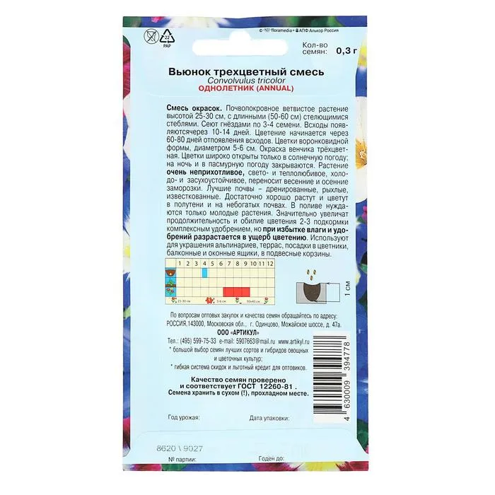 Почвопокровное ветвистое растение высотой 25-30 см, с длинными (50-60 см) стелющимися стеблями. Сеют гнёздами по 3-4 семени. Всходы появляются через 10-14 дней. Цветение начинается через 60-80 дней от появления всходов. Цветки воронковидной формы, диаметром 5-6 см. Окраска венчика трёхцветная. Цветки широко открыты только в солнечную погоду; на ночь и в пасмурную погоду закрываются. Растение очень неприхотливое, свето- и теплолюбивое, холодо- и засухоустойчивое, переносит весенние и осенние заморозки. Лучшие почвы – дренированные, рыхлые, известкованные. Достаточно хорошо растут и цветут в полутени и на небогатых почвах. В поливе нуждаются только молодые растения. Значительно увеличат продолжительность и обилие цветения 2-3 подкормки комплексным удобрением, но при избытке влаги и удобрений разрастается в ущерб цветению. Используют для украшения альпинариев, террас, посадки в цветники, балконные и оконные ящики, в подвесные корзины.