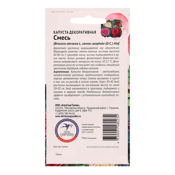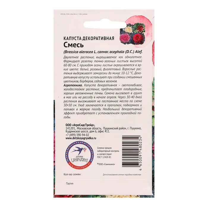Двулетнее растение выращиваемое как однолетнее. Формирует розетку темно-зеленых листьев высотой 60-80 см. С приходом осени листья окрашиваются в яркие цвета: белый, розовый, фиолетовый. Взрослые растения выдерживает заморозки до минус 10-12 °С. Декоративную капусту используют при создании смешанных цветников, бордюров, садовых вазонов. Агротехника: Капуста декоративная – светолюбивое, холодостойкое растение, предпочитает плодородные, хорошо увлажненные почвы. Семена высевают в грунт в мае или на рассаду в начале апреля. Через 30-40 дней растения высаживают на постоянное место по схеме 50×50 см. Уход заключается в прополках, подкормках и поливах в жаркую погоду. Наибольший декоративный эффект приобретает с установлением прохладной погоды. Штрих-код - 4650091480234