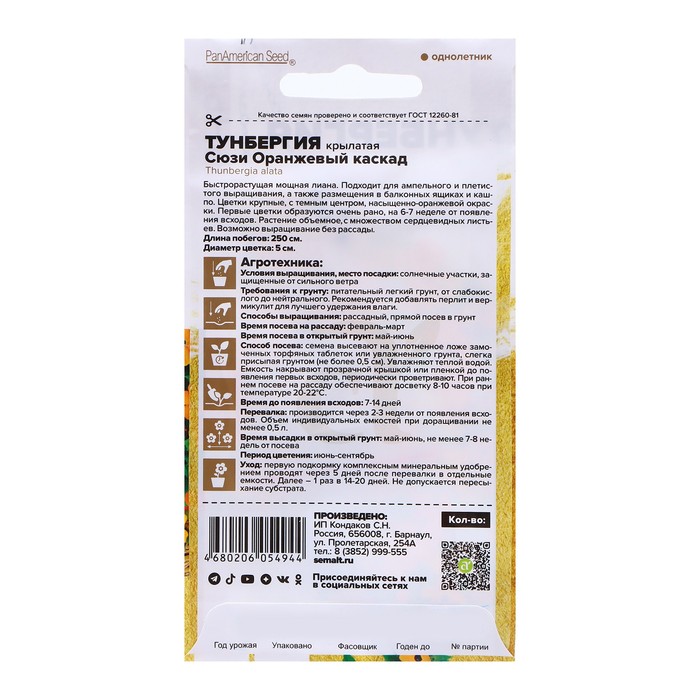 Семена Тунбергия "Сюзи Оранжевый", ц/п, 4 шт. — Характеристики