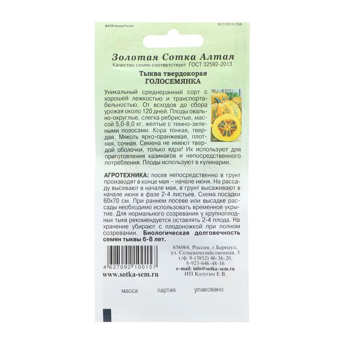 Семена тыквы «Голосемянка» идеально подходят для выращивания в открытом грунте и принесут щедрый урожай в средней стадии созревания. Этот сорт обладает стойкостью к различным условиям и имеет долгий агрономический срок годности — до 7 лет, что делает его практичным выбором для вашего сада.