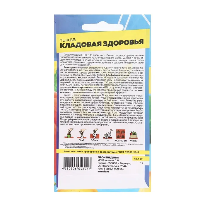 Тыква рекомендуется для детского и диетического питания. Из нее получаются полезные соки, запеканки и другие блюда. Ввиду того, что блюда из тыквы очень хорошо усваиваются, она нормализует метаболизм в организме человека. Высокое содержание фосфора и кальция способствует укреплению костных тканей. Тыква «Кладовая здоровья» является лидером по содержанию калия, благодаря чему нормализует деятельность нервной системы, полезна для сердца. Содержание витамина А восполняет 47,3% нормы потребления этого элемента взрослым человеком, а содержание бета-каротина составляет 62% от суточной нормы. Употребление блюд из тыквы в пищу способствует выведению солей. Состав аминокислот семян тыквы имеет антипаразитарный эффект.