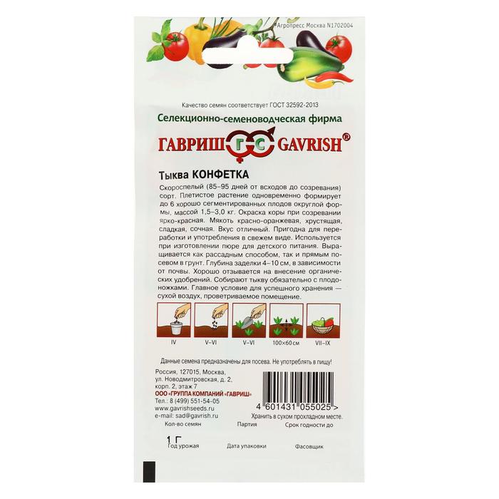 Скороспелый (85-95 дней от всходов до созревания) сорт. Плетистое растение одновременно формирует до 6 хорошо сегментированных плодов округлой формы, массой 1,5-3,0 кг. Окраска коры при созревании ярко-красная. Мякоть красно-оранжевая, хрустящая, сладкая, сочная. Вкус отличный. Обладает качествами пригодными для переработки и потребления в свежем виде. Используется при изготовлении пюре для детского питания. Выращивается как рассадным способом, так и прямым посевом в грунт. Глубина заделки 4-10 см, в зависимости от почвы. Хорошо отзывается на внесение органических удобрений. Собирают тыкву обязательно с плодоножками. Главное условие для успешного хранения – сухой воздух, проветриваемое помещение.