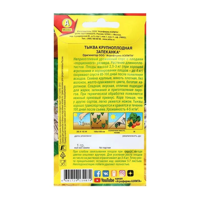 Неприхотливый урожайный сорт с плодами "порционного" размера. Растение длинноплетистое. Плоды массой 2,5-3 кг (при хорошей агротехнике и нормировании плодов до 4 кг) созревают спустя 85-100 дней после появления всходов. Семена крупные, мякоть плотная, без волокон, желто-оранжевого цвета, богатая каротином. Сладкая, вкусная, отлично подходит для жарки, запекания и приготовления пирогов. При термической обработке появляется нежный ореховый привкус. Кора тоньше, чем у других сортов, легко режется ножом. Тыквы хорошо транспортируются и хранятся в течение 100 дней после съема. Урожайность 4-5 кг/кв. м. При слабом завязывании плодов при плохой погоде цветки опыляют вручную. Для усиления роста плодов их число на растении ограничивают до 3-4 штук. Точку роста прищипывают, оставляя над завязями 5-7 листьев. Неплодоносящие побеги удаляют полностью.