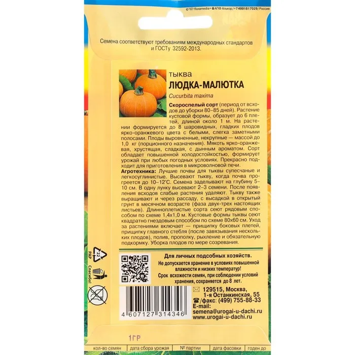 Тыква Людка-Малютка – скороспелый сорт (период от всходов до уборки 80-85 дней). Растение кустовой формы, образует до 6 плетей, длиной около 1 м. На растении формируется до 8 шаровидных, гладких плодов ярко-оранжевого цвета с белыми, слегка заметными полосами.