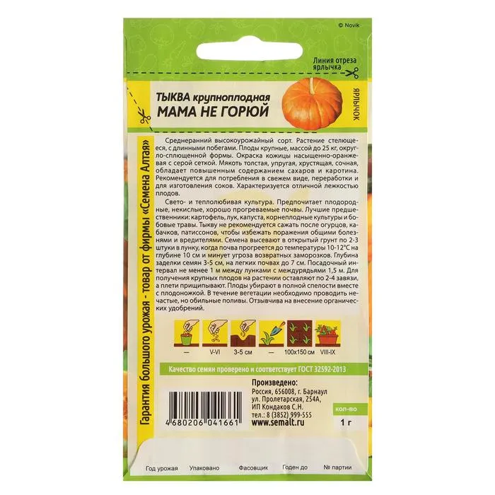 Среднеранний высокоурожайный сорт. Растение стелющееся, с длинными побегами. Плоды крупные, массой до 25 кг, округло-сплющенной формы. Окраска кожицы насыщенно-оранжевая с серой сеткой. Мякоть толстая, упругая, хрустящая, сочная,обладает повышенным содержанием сахаров и каротина. Рекомендуется для потребления в свежем виде, переработки и для изготовления соков. Характеризуется отличной лежкостью плодов. Свето- и теплолюбивая культура. Предпочитает плодородные, некислые, хорошо прогреваемые почвы. Лучшие предшественники: картофель, лук, капуста, корнеплодные культуры и бобовые травы. Тыкву не рекомендуется сажать после огурцов, кабачков, патиссонов, чтобы избежать поражения общими болезнями и вредителями. Семена высевают в открытый грунт по 2-3 штуки в лунку, когда почва прогреется до температуры 10-12°С на глубине 10 см и минует угроза возвратных заморозков. Глубина заделки семян 3-5 см, на легких почвах до 7 см. Посадочный интервал не менее 1 м между лунками с междурядьями 1,5 м. Для получения крупных плодов на растении оставляют по 2-4 завязи, а плети прищипывают. Плоды убирают в полной спелости вместе с плодоножкой. В течение вегетации необходимо проводить нечастые, но обильные поливы. Отзывчива на внесение органических удобрений.