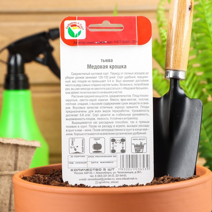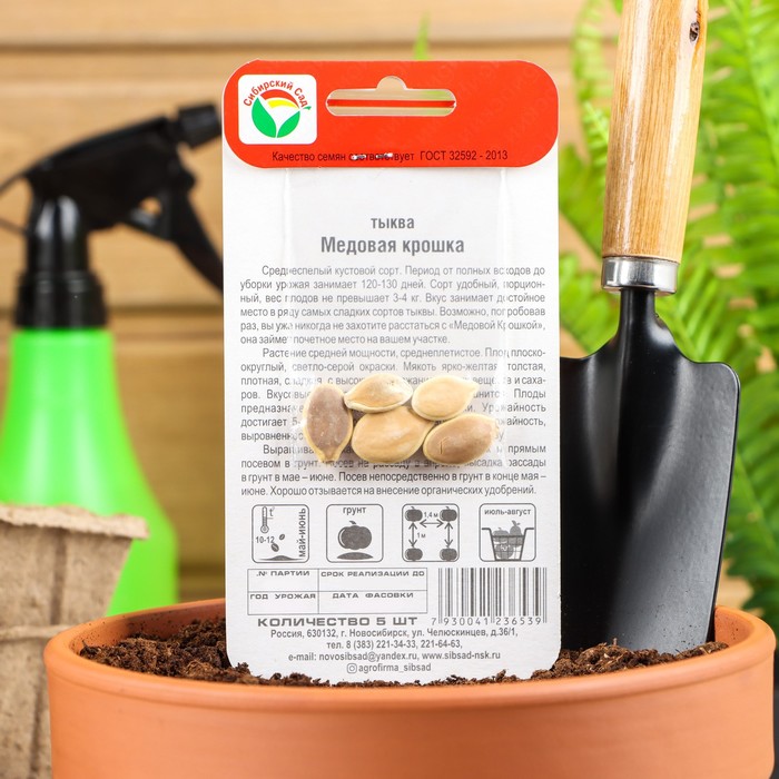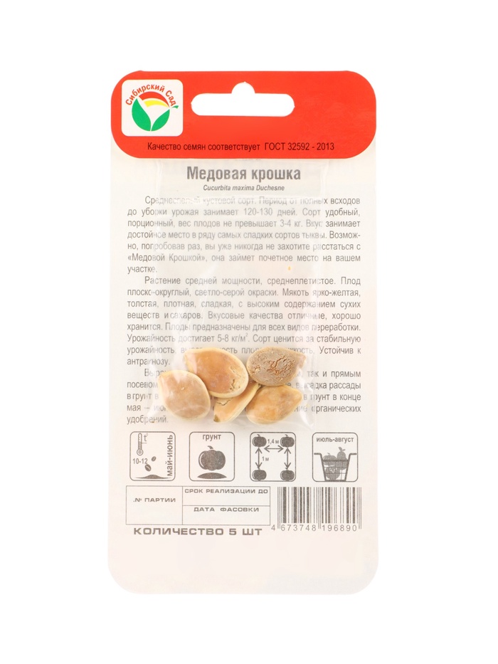 Среднеспелый кустовой сорт. Период от полных всходов до уборки урожая занимает 120-130 дней. Сорт удобный, порционный, вес плодов не превышает 3-4 кг. Вкус занимает достойное место в ряду самых сладких сортов тыквы. Возможно, попробовав раз, вы уже никогда не захотите расстаться с «Медовой Крошкой», она займет почетное место на вашем участке.