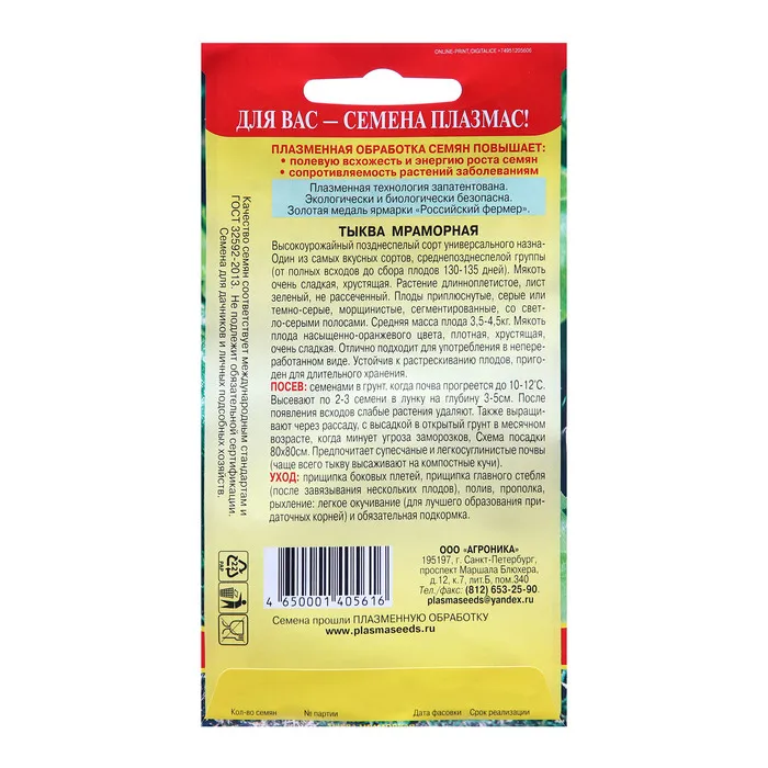 Эти семена подарят вашему саду надежное и вкусное пополнение, ведь крупные и питательные плоды тыквы «Мраморная» станут настоящей наградой за ваши усилия в огородничестве.