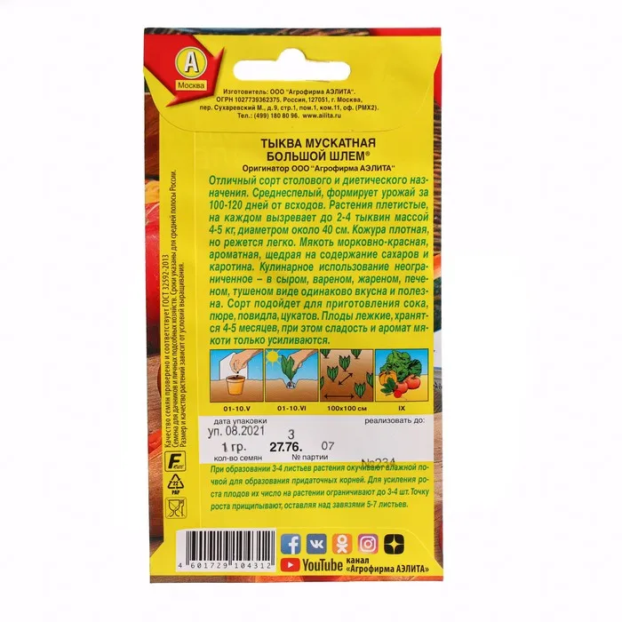 Вкусная тыква столового и диетического назначения. Сорт среднеспелый, формирует урожай примерно за 100-110 дней от всходов. Растения среднеплетистые, засухоустойчивые; на каждом вызревает 2-4 плоскоокруглых плода с сегментированной поверхностью, массой 4-5 кг. Кожура оранжево-коричневая, кожистая, с восковым налетом; режется легко. Семенное гнездо небольшое. Мякоть морковно-красная, ароматная, хрустящая, с высоким содержанием сахаров, каротина, пектиновых веществ, полезных микроэлементов. Кулинарное использование неограниченное – в сыром, вареном, жареном, печеном, тушеном виде; приготовление сока, пюре, повидла, цукатов. Плоды лежкие, хранятся 4-5 месяцев без потери качества.