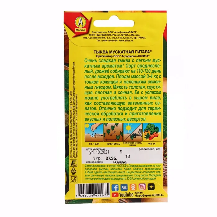 Высокоурожайный сорт с отличной лёжкостью плодов – до 100 дней. Период от всходов до съема плодов составляет 110-120 дней. Плоды массой 2-4 кг, по внешнему виду напоминают гитару. Мякоть очень сладкая, сочная, хрустящая, ароматная, богата клетчаткой, витаминами, полезными минералами и каротином. Дегустационная оценка – 4,9 балла по 5-балльной шкале. Из неё получается вкуснейшая начинка для пирогов и аппетитные цукаты. Средняя урожайность – 6-10 кг/м2.
