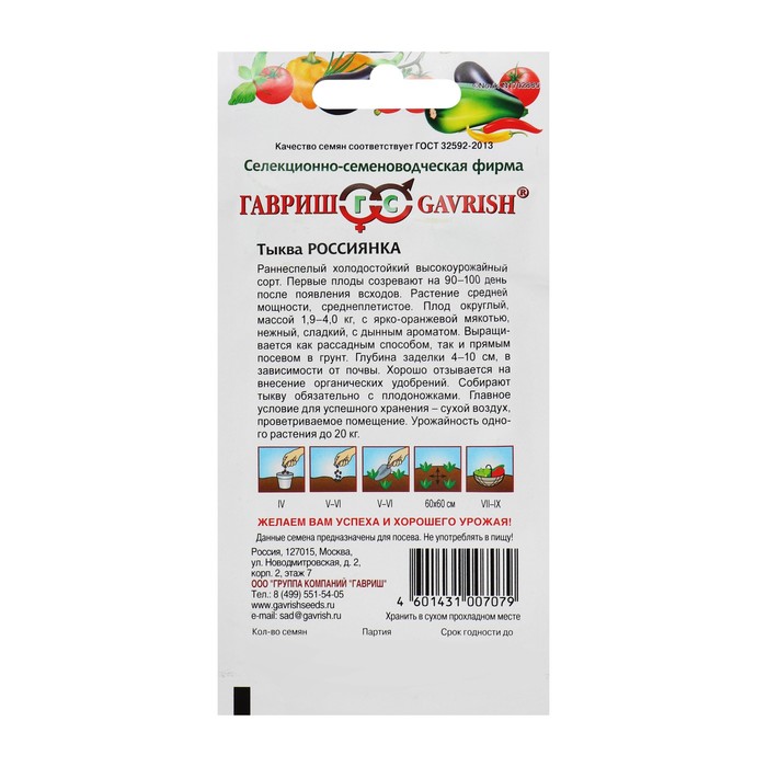 Семена Тыква «Россиянка», раннеспелый, 2.0 г, «Гавриш» — Характеристики