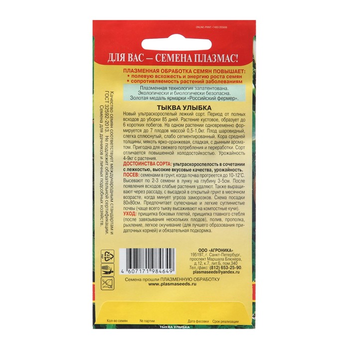 Посев: семенами в грунт, когда почва прогреется до 10-12°С. Высевают по 2-3 семени в лунку на глубину 3-5см. После появления всходов слабые растения удаляют. Также выращивают через рассаду, с высадкой в открытый грунт в месячном возрасте, когда минует угроза заморозков. Схема посадки 80×80см. Предпочитает супесчаные и легкие суглинистые почвы (чаще всего тыкву высаживают на компостные кучи).
