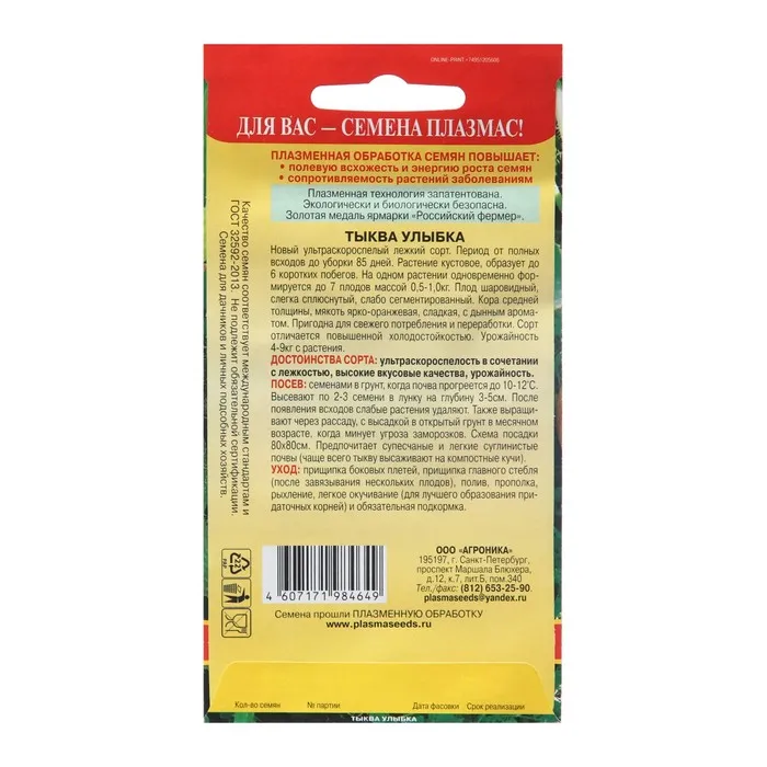 Новый ультраскороспелый лежкий сорт. Период от полных всходов до уборки 85 дней. Растение кустовое, образует до 6 коротких побегов. На одном растении одновременно формируется до 7 плодов массой 0,5-1,0кг. Плод шаровидный, слегка сплюснутый, слабо сегментированный. Кора средней толщины, мякоть ярко-оранжевая, сладкая, с дынным ароматом. Пригодна для свежего потребления и переработки. Сорт отличается повышенной холодостойкостью. Урожайность 4-9кг с растения.