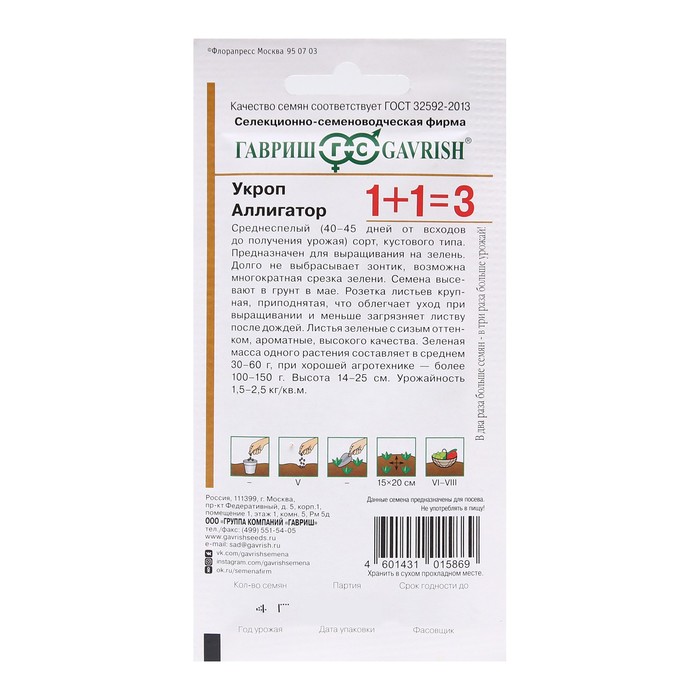 Семена Укроп «Аллигатор», 4 г, «1+1 Гавриш» — Характеристики