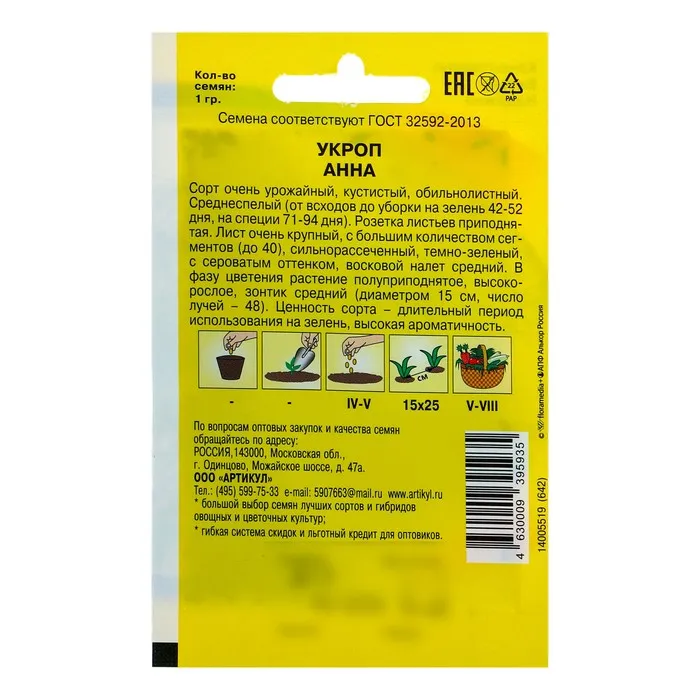 Сорт очень урожайный, кустистый, обильнолиственный. Среднеспелый (от всходов до уборки на зелень 42-52 дня, на специи 71-94 дня). Розетка листьев приподнятая. Лист очень крупный, с большим количеством сегментов (до 40), сильнорассечённый, тёмно-зелёный, с сероватым оттенком, восковой налёт средний. В фазу цветения растение полуприподнятое, высокорослое, зонтик средний (диаметром 15 см, число лучей 48).