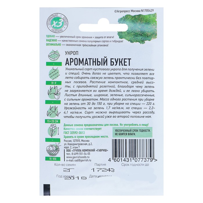 Уникальный сорт кустового укропа для получения зелени и специй. Очень долго не цветет, что позволяет все лето собирать свежую зелень практически без повторных посевов. Растение компактное, средней высоты, с приподнятой розеткой, благодаря чему зелень не загрязняется во время дождей и ее легко убирать. Листья длинные, широкие, зеленые, сильнорассеченные, с сильным ароматом. Масса одного растения при уборке на зелень от 30 до 150 г, при уборке на специи — 220 г. Урожайность на зелень 1,7 кг/м², на специи — 2,2-4,1 кг/м². Посев семян в грунт производят в конце апреля - начале мая. Сорт можно выращивать через рассаду, чтобы получить урожай уже во второй половине мая.