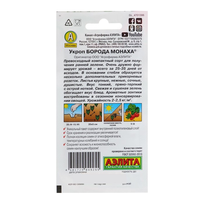«Борода монаха» — это раннеспелый сорт укропа, у которого товарная урожайность зелени составляет 2–2,5 кг/м², а специй — 4,5 кг/м². Подходит для употребления в свежем виде, сушения и замораживания.