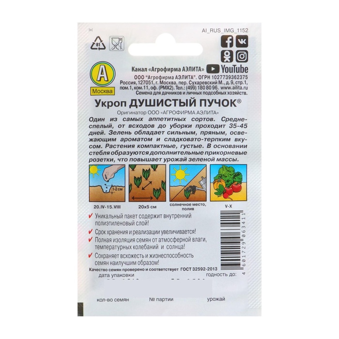 «Душистый пучок» — это среднеспелый сорт укропа, молодые побеги которого активно используются в кулинарии в качестве специй. Отличается замедленным заложением соцветий. Пригоден для подзимнего посева в ноябре.