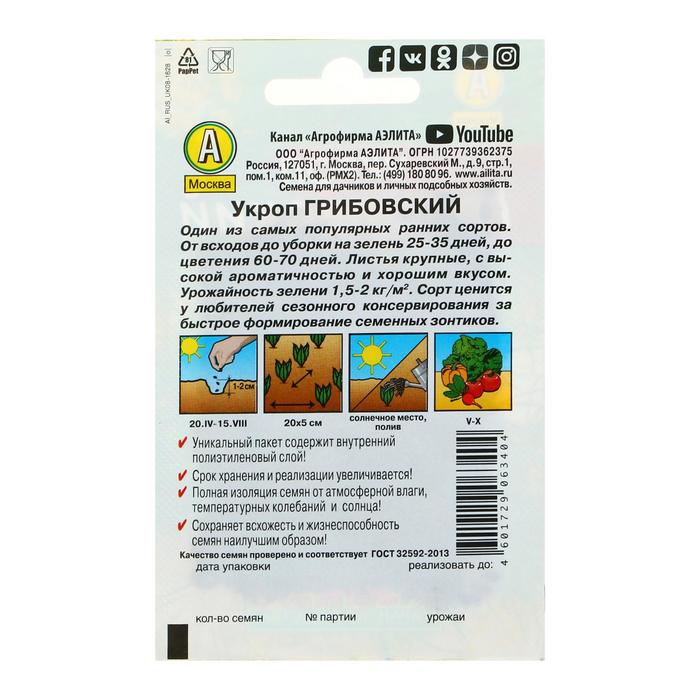 «Грибовский» — это среднеспелый сорт укропа, который подходит для выращивания в открытом и защищённом грунте. Период от всходов до уборки на зелень составляет 30–40 дней, на специи — 85–100 дней.