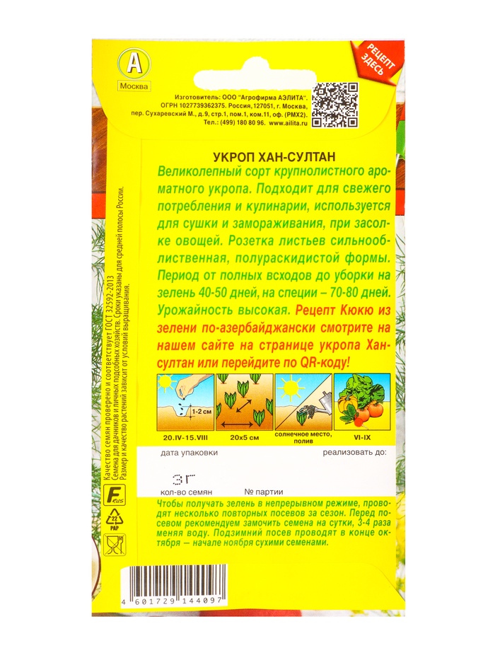 Семена Укроп Хан-Султан Блюда стран мира, Ц/П,3 г — Характеристики