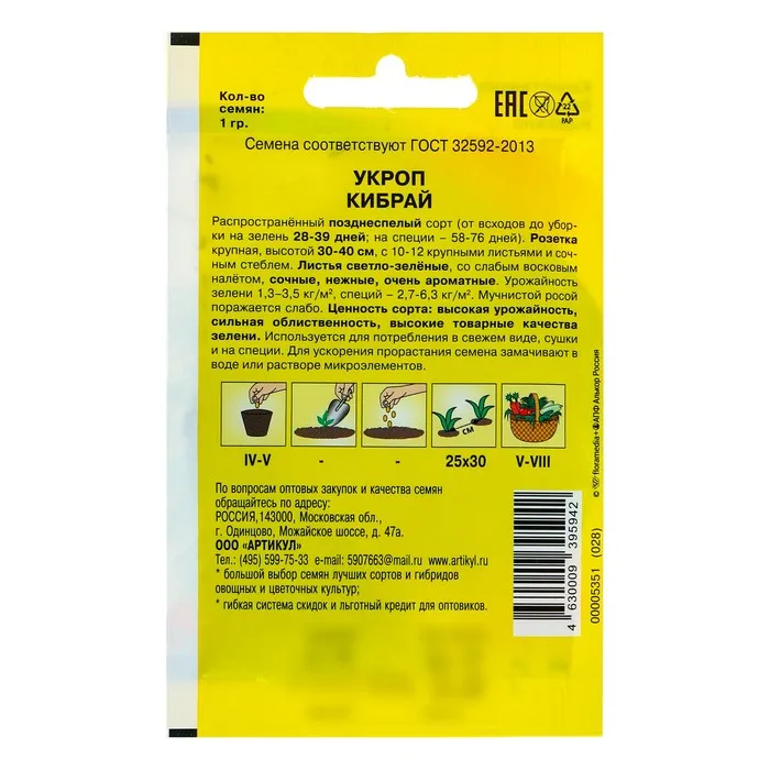 Распространённый позднеспелый сорт (от всходов до уборки на зелень 28–39 дней; на специи – 58-76 дней). Розетка крупная, высотой 30-40 см, с 10-12 крупными листьями и сочным стеблем. Листья светло-зелёные, со слабым восковым налётом, сочные, нежные, очень ароматные. Урожайность зелени 1,3–3,5 кг/м2, специй – 2,7-6,3 кг/м2. Мучнистой росой поражается слабо. Ценность сорта: высокая урожайность, сильная облиственность, высокие товарные качества зелени. Используется для потребления в свежем виде, сушки и на специи. Для ускорения прорастания семена замачивают в воде или растворе микроэлементов.
