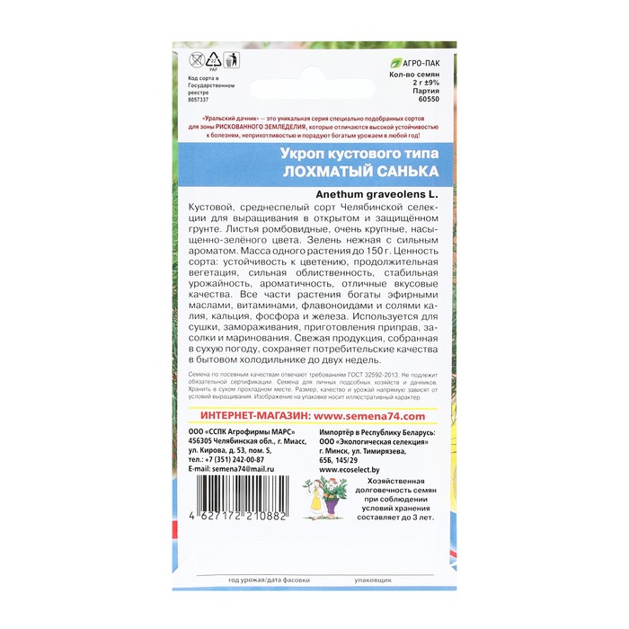 Кустовой, среднеспелый сорт Челябинской селекции для выращивания в открытом и защищённом грунте. Листья ромбовидные, очень крупные, насыщенно-зелёного цвета. Зелень нежная с сильным ароматом. Масса одного растения до 150 г. Ценность сорта: устойчивость к цветению, продолжительная вегетация, сильная облиственность, стабильная урожайность, ароматичность, отличные вкусовые качеств. Все части растения богаты эфирными маслами, витаминами, флавоноидами и солями калия, кальция, фосфора и железа. Используется для сушки, замораживания, приготовления приправ, засолки и маринования. Свежая продукция, собранная в сухую погоду, сохраняет потребительские качества в бытовом холодильнике до двух недель.