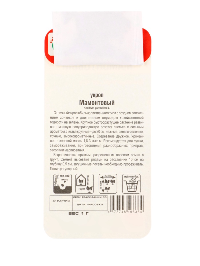 Среднеспелый обильнолиственный сорт, с поздним заложением соцветий и длительным периодом хозяйственной годности на зелень. Листья светло-зеленые, крупные, нежные, сочные, очень ароматные. Ценность сорта: стабильная урожайность, высокая ароматичность. Рекомендуется для сушки, замораживания, приготовления приправ, засолки и маринования.Посев в открытый грунт проводят в конце апреля – начале мая, на глубину 0,5-1 см с расстоянием между рядами 5-10 см. Посевы не загущать! Для получения зелени в непрерывном режиме, проводят повторные посевы, с интервалом 14-20 дней, до середины августа. Уход заключается в прополке, поливе и подкормках. Для получения более ранней зелени укроп высевают под зиму, во второй декаде октября. Растения очень быстро отрастают после срезки.
