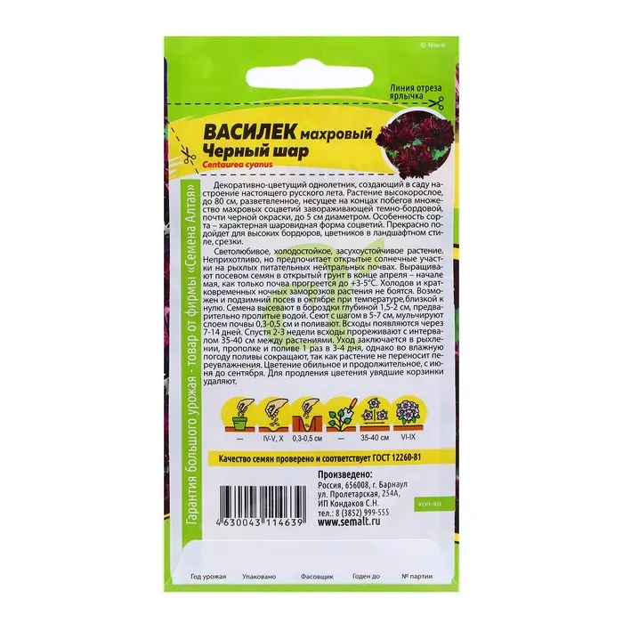 Декоративно-цветущий однолетник, создающий в саду настроение настоящего русского лета. Растение высокорослое, до 80 см., разветвленное, несущее на концах побегов множество махровых соцветий завораживающей темно-бордовой, почти черной окраски, до 5 см. диаметром. Особенность сорта – характерная шаровидная форма соцветий. Цветение длится с июня по август, для продления цветения увядшие корзинки удаляют. Прекрасно подойдет для высоких бордюров, цветников в ландшафтном стиле, срезки. Светолюбивое, холодостойкое, засухоустойчивое растение, не выносит переувлажнения. Предпочитает открытые солнечные участки на рыхлых суглинистых, богатых известью питательных почвах с нейтральной кислотностью. Выращивают посевом семян в открытый грунт в конце апреля - начале мая, как только почва прогреется до +3-5°C. Холодов и кратковременных ночных заморозков растения не боятся. Возможен и подзимний посев в октябре при температуре близкой к нулю. Подзимний посев позволяет достичь более раннего цветения. Перед посевом почву перекапывают на штык лопаты и вносят подкормку из расчета на 1м2: 2 кг перегноя, 100 г древесной золы и 1 ст. ложку нитрофоски. Семена высевают в бороздки глубиной 1,5-2 см, предварительно пролитые водой. Сеют с шагом в 5-7 см, мульчируют слоем почвы 0,3-0,5 см и поливают. Чтобы ускорить появление всходов, избежать пересыхания почвы и образования корки на поверхности, гряды накрывают агроволокном. Полив выполняют поверху 1 раз в 3-4 дня. Необходимое время на прорастание семян 7-14 дней. Спустя 2-3 недели всходы прореживают с интервалом 35-40 см между растениями.