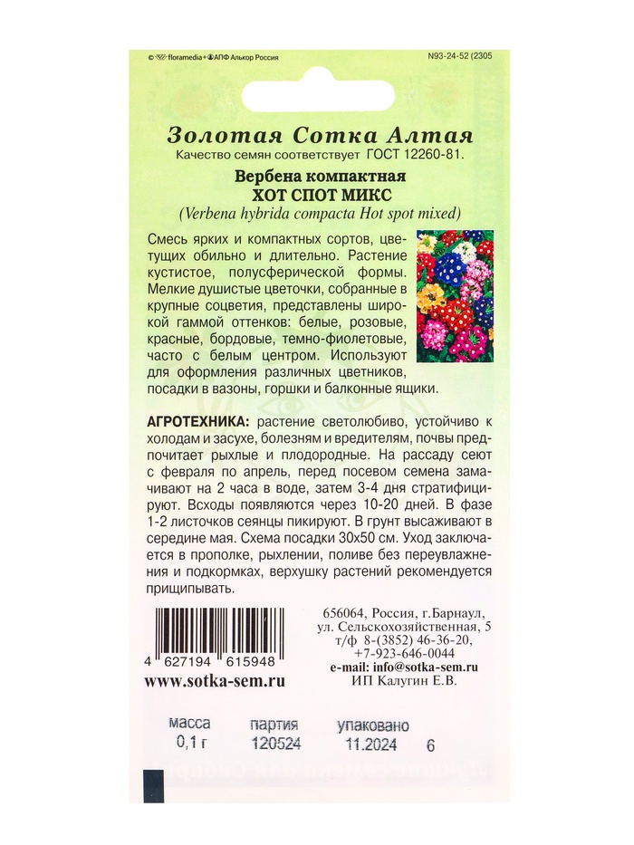 Семена Вербена компактная «Хот Спот Микс», смесь, 0.1 г, «Золотая Сотка Алтая» — Характеристики