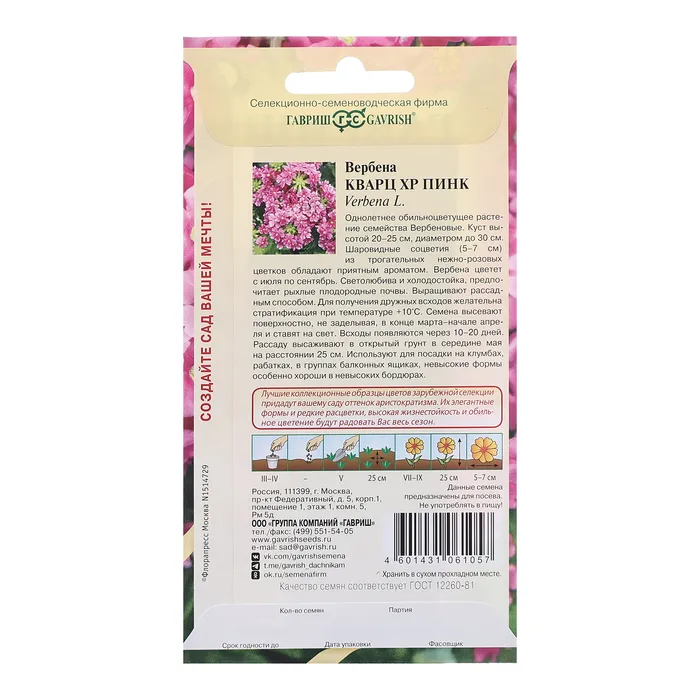 Семена Вербена "Кварц XP Пинк", ц/п, 4 шт. — Характеристики