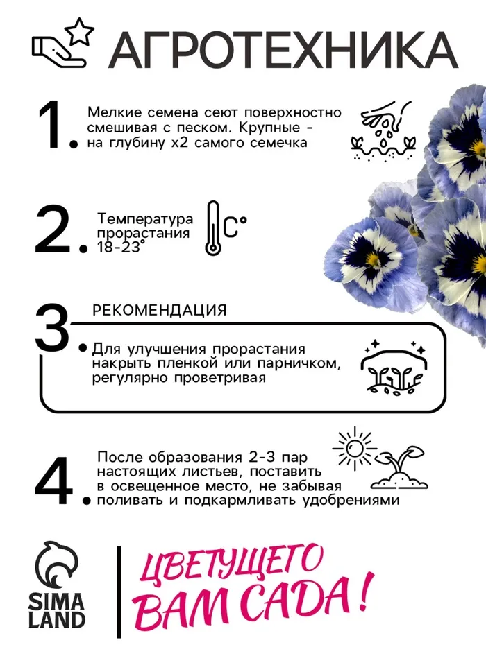 Восхитительная серия крупноцветковой гибридной виолы благодаря необычным оттенкам станет центральным украшением балкона или любого садового пространства. Цветет обильно и продолжительно, с мая по сентябрь. Цветки сочетают красивый рисунок нежно- голубых и белых тонов, с темным центром и ярким желтым глазком. Диаметр цветков 6 см. Растение влаголюбивое, холодостойкое, хорошо растет на солнце и в полутени. Для получения растений, цветущих в год посева, семена высевают на рассаду в феврале-марте. Всходы появляются через 5-7 дней. В открытый грунт рассаду высаживают в конце апреля-начале мая на расстоянии 20 см. Хорошо переносит пересадку в цветущем состоянии. При посеве в открытый грунт в июне-июле, цветение наступает во второй год. Используют для посадки на клумбы, в рабатки, балконные ящики и садовые вазы.