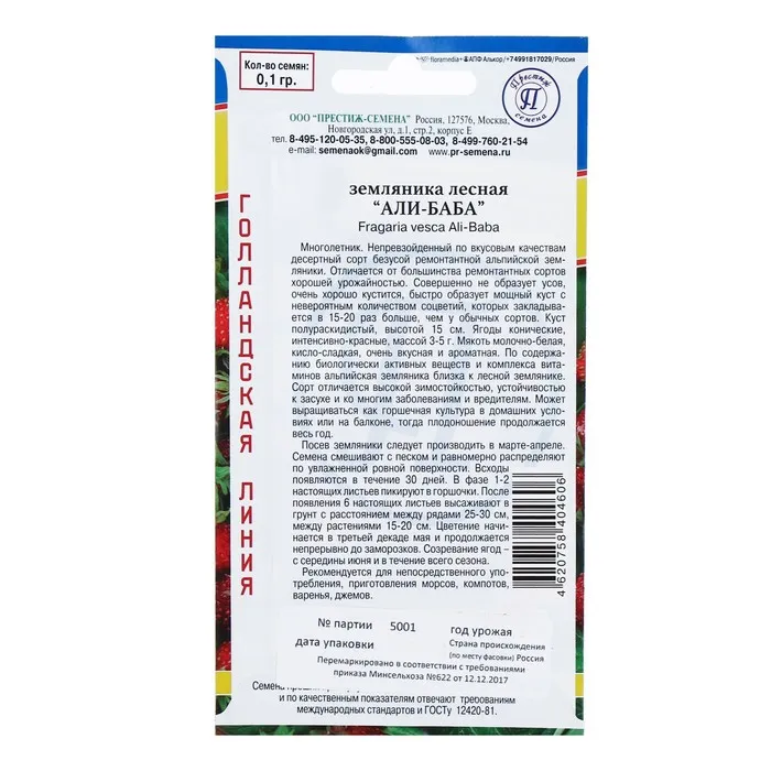 Многолетник. Непревзойденный по вкусовым качествам десертный сорт безусой ремонтантной альпийской земляники. Отличается от большинства ремонтантных сортов хорошей урожайностью. Совершенно не образует усов, очень хорошо кустится, быстро образует мощный куст с невероятным количеством соцветий, которых закладывается в 15-20 раз больше, чем у обычных сортов. Куст полураскидистый, высотой 15 см. Ягоды конические, интенсивно-красные, массой 3-5 г. Мякоть молочно-белая, кисло-сладкая, очень вкусная и ароматная. По содержанию биологически активных веществ и комплекса витаминов альпийская земляника близка к лесной землянике. Сорт отличается высокой зимостойкостью, устойчивостью к засухе и ко многим заболеваниям и вредителям. Может выращиваться как горшечная культура в домашних условиях или на балконе, тогда плодоношение продолжается весь год. Посев земляники следует производить в марте-апреле. Семена смешивают с песком и равномерно распределяют по увлажненной ровной поверхности. Всходы появляются в течение 30 дней. В фазе 1-2 настоящих листьев пикируют в горшочки. После появления 6 настоящих листьев высаживают в грунт с расстоянием между рядами 25-30 см, между растениями 15-20 см. Цветение начинается в третьей декаде мая и продолжается непрерывно до заморозков. Созревание ягод - с середины июня и в течение всего сезона. Рекомендуется для непосредственного употребления, приготовления морсов, компотов, варенья, джемов.