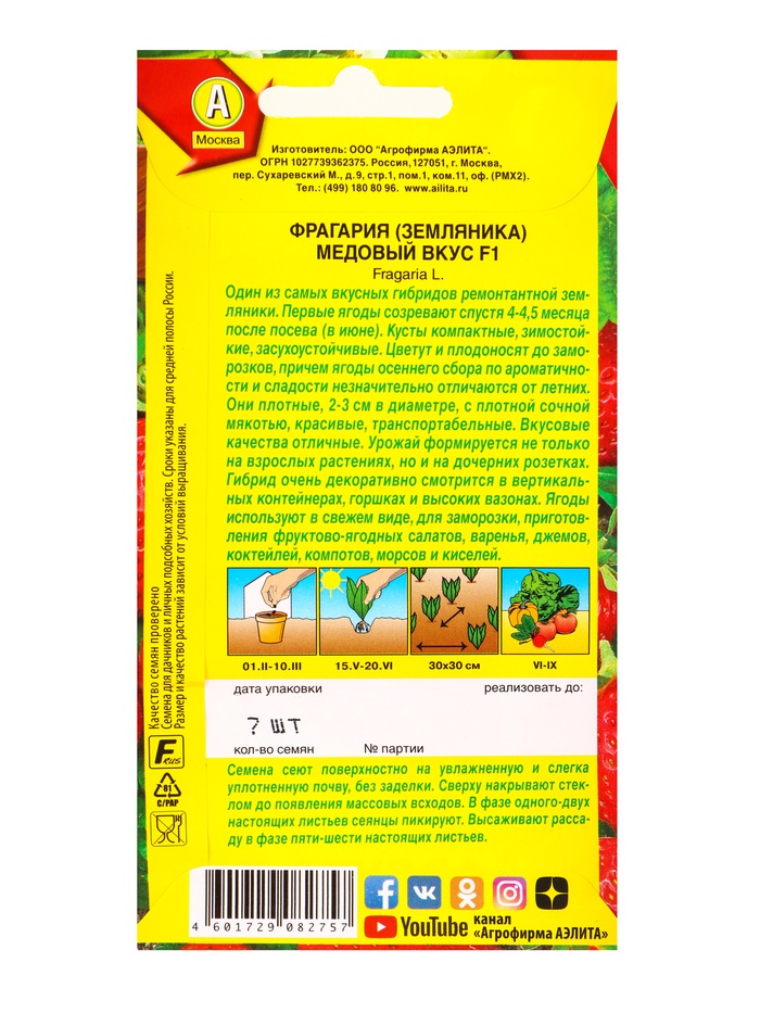 Семена Земляника «Медовый вкус», ремонтантная, крупноплодная, F1, «АЭЛИТА», 7 шт. — Характеристики