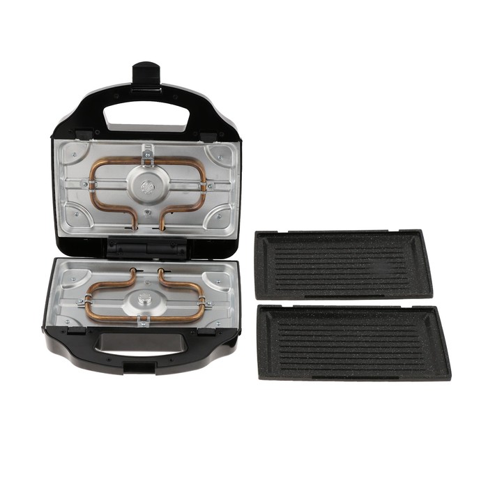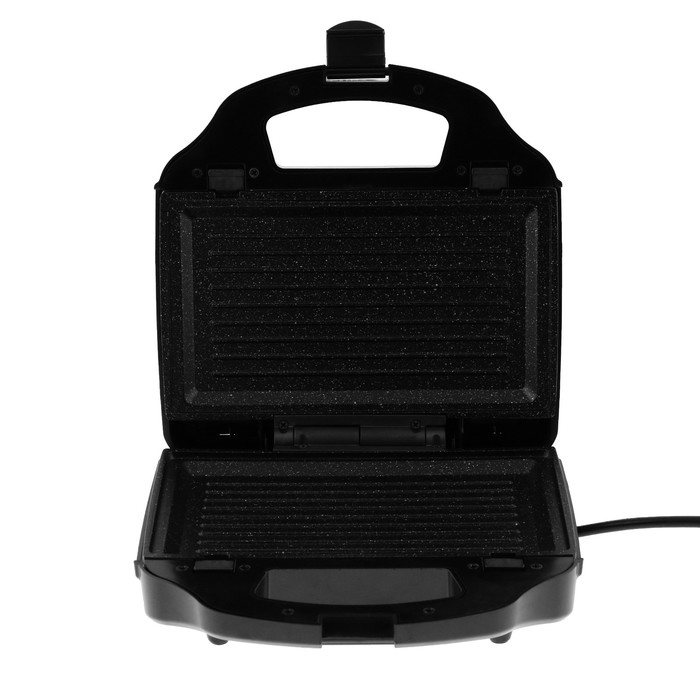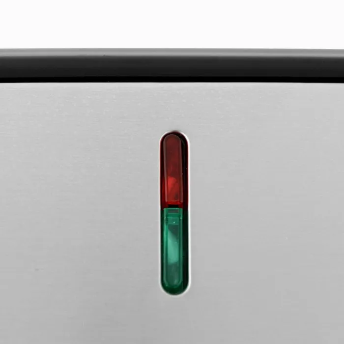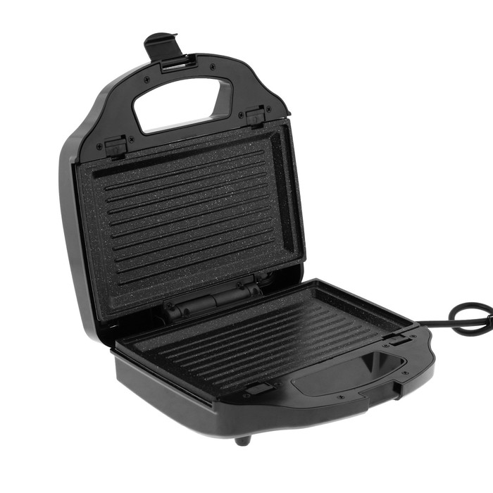 Панели снабжены антипригарным покрытием. Термоизолированная ручка оберегает от прикосновения к рабочим поверхностям, а корпус сделан из надёжного пластика. Прорезиненные ножки помогут удерживать прибор на столе.