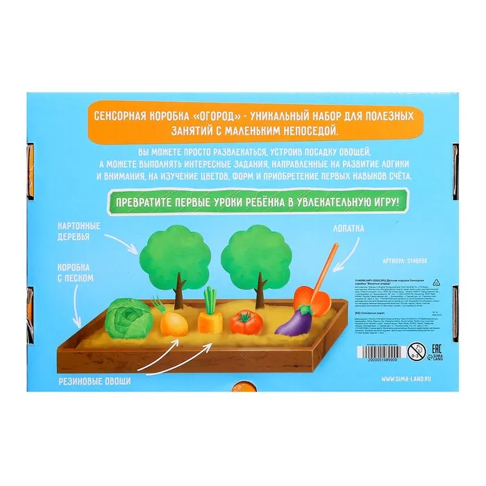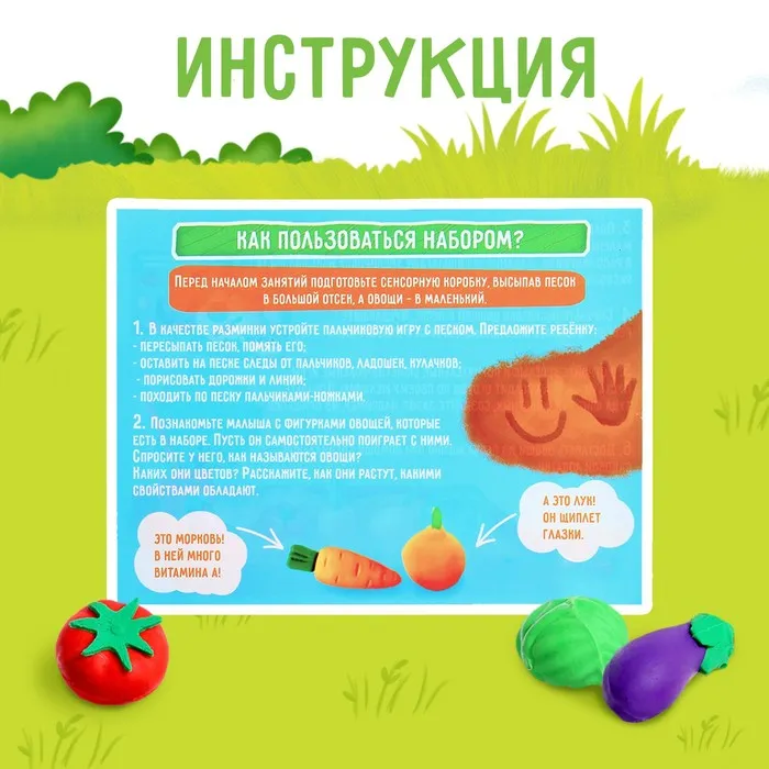 Подготовьте сенсорную коробку: высыпьте песок в большой отсек, а овощи — в маленький.