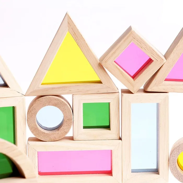 Малыш будет строить из радужных блоков разные фигуры. Отличительной чертой является то, что можно смотреть через прозрачные окошки деталей. Во время игры ребёнок задействует творческие и исследовательские навыки. В процессе построения и выбора блоков дети изучают простые математические концепции формы, баланса и размеров.