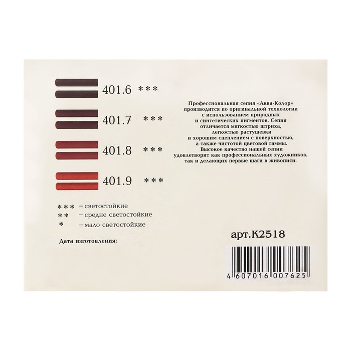 Классическая пастель "Аква-Колор" отличается мягкостью штриха, лёгкостью растушёвки и хорошим сцеплением с поверхностью, а также чистотой цветовой гаммы.