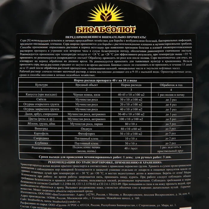 Сера коллоидная. Фунгицид, инсектоакарицид. Порошок
