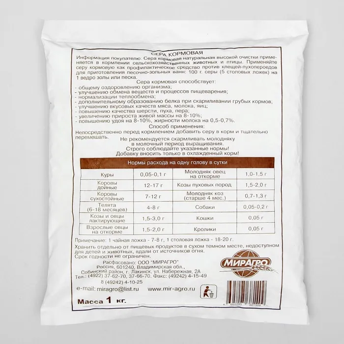 Способ применения: 100 г серы (5 столовых ложек) на 1 ведро золы или песка. Непосредственно перед кормлением добавить серу в корм и тщательно перемешать. Не рекомендуется скармливать молодняку в молочный период выращивания. Строго соблюдайте указанные нормы. Добавку вносить только в охлажденный корм! 1 чайная ложка 7-8г, 1 столовая ложка 18-2 г. Рекомендуемые нормы ввода в грамм в сутки: куры 0,05 – 0,1 г, молодняк овец на откорме 1,0 – 1,5 г, коровы дойные 12 – 17 г, козы пуховых пород 1,5 – 2,0 г, коровы сухостойные 7 – 12 г, молодняк коз (старше 4 мес.) 0,7 – 1,3 г, кролики 0,05 г.