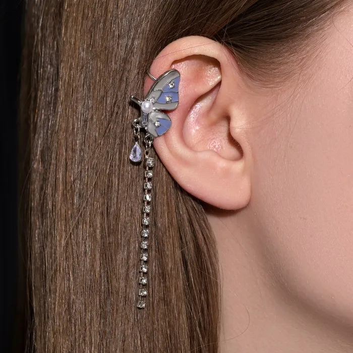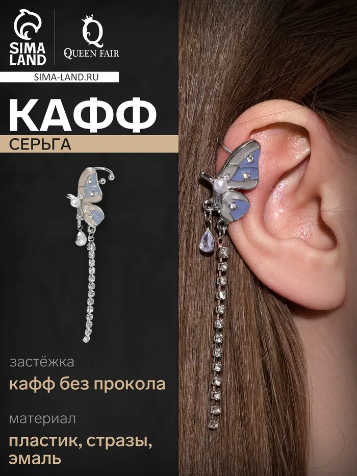 С длиной 7,5 см и изготовленный из бижутерного сплава, этот аксессуар не только красив, но и практичен. Благодаря застёжке без прокола, серьга легко надевается и снимается, обеспечивая комфорт в течение всего дня. Эмаль и стразы, использованные в дизайне, добавляют блеска и делают каждую деталь уникальной.