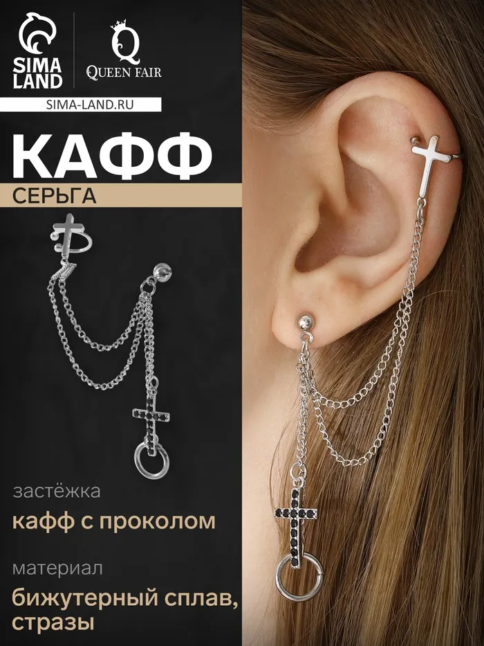 Серьга «Кафф» два креста с кругом, цвет чёрный в серебре — Характеристики