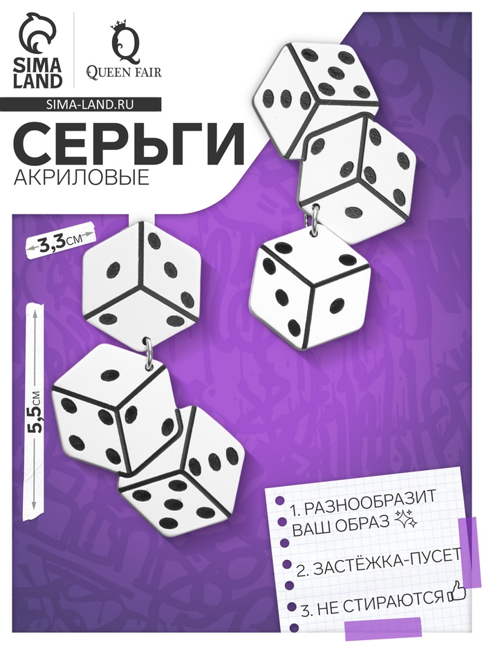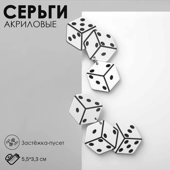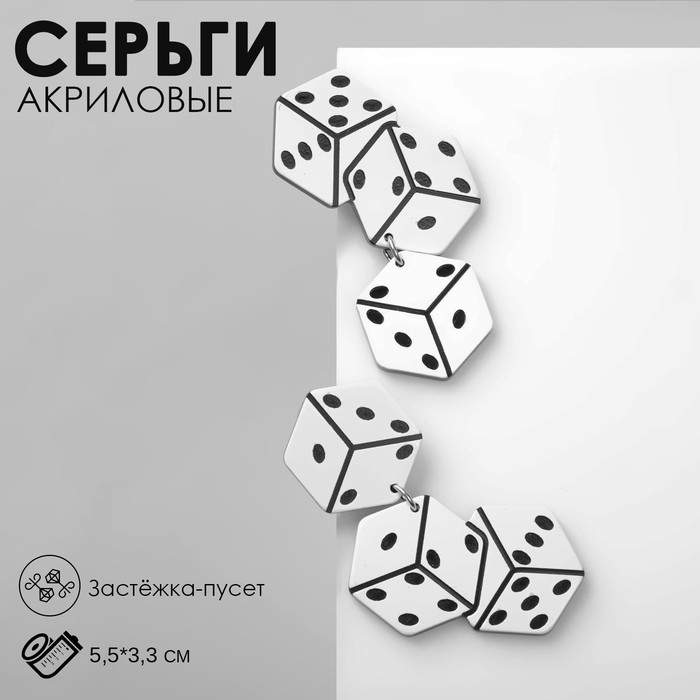 Серьги акриловые «Кости» игральные, цвет чёрно-белый в серебре — Характеристики