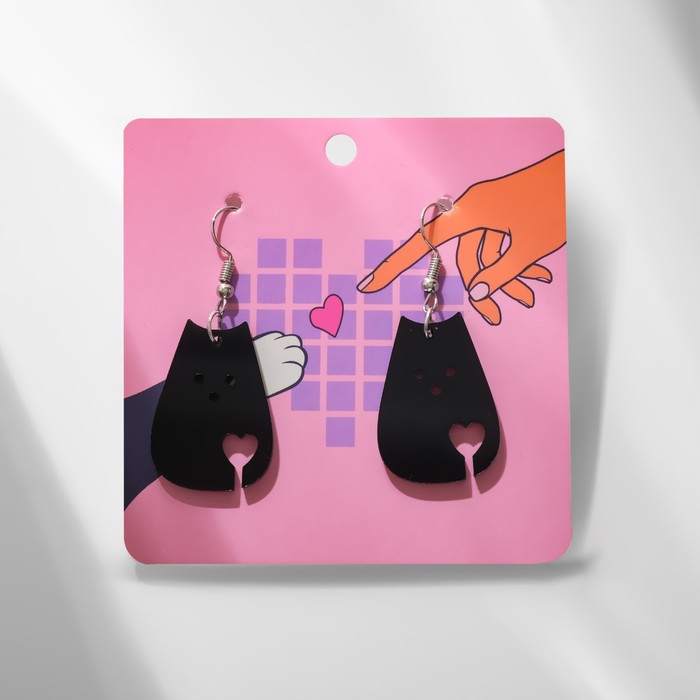 Серьги акриловые «Котик» с сердечком, чёрные в серебре