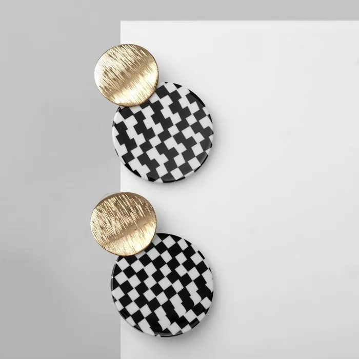 Современный дизайн и лаконичная геометрия воплощены в этих серьгах с акриловыми вставками в чёрно-белой палитре на золотистой металлической основе. Длина 4,8 см позволяет создать выразительный, но при этом элегантный образ, который легко впишется в любой гардероб.