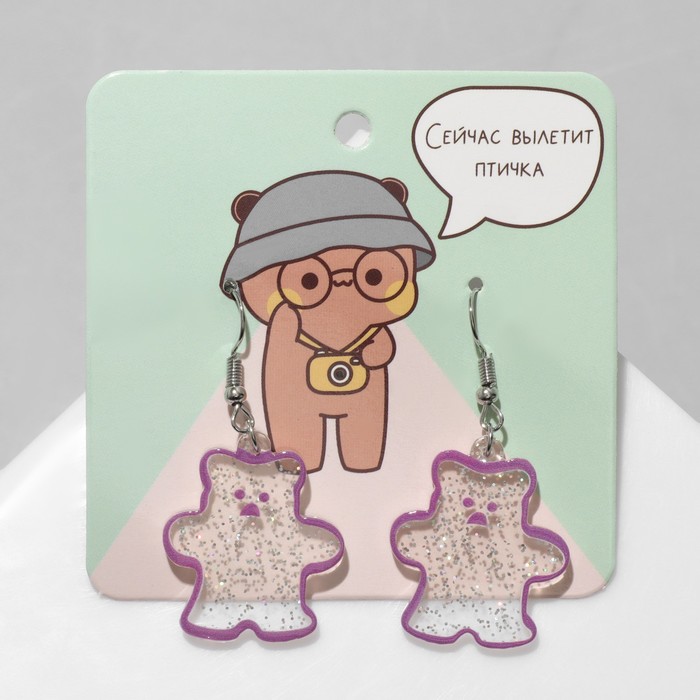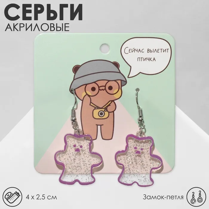 Серьги акриловые «Мишка» в блёстках, цвет радужно-фиолетовый в серебре — Характеристики