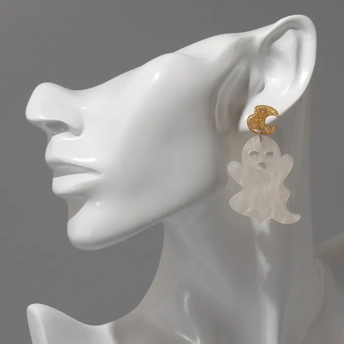 Серьги с акриловыми вставками в виде милых привидений, выполненные в бело-золотистых тонах на серебристой металлической основе, создают необычный и стильный образ с лёгкой игрой контрастов. Их длина 5,3 см делает украшение заметным, но при этом комфортным для повседневного ношения и тематических вечеринок.